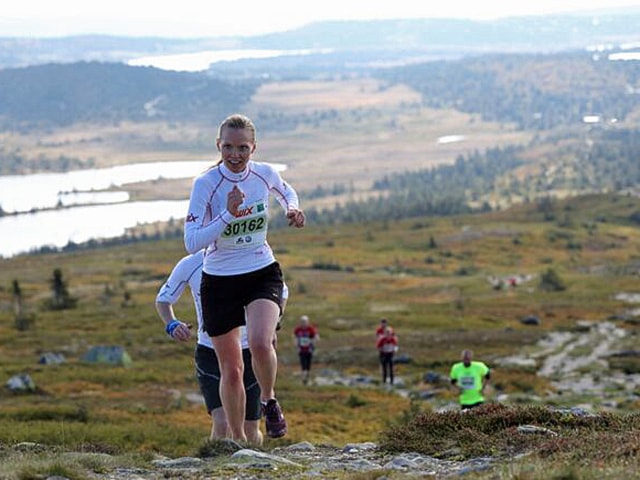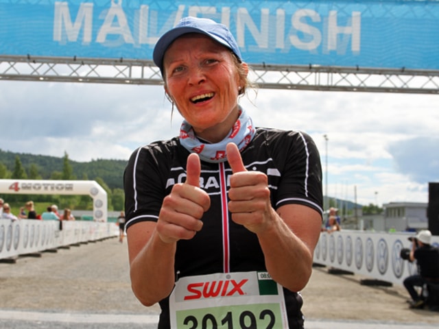 Det ble en lokal vinner i kvinneklassen i Birken Fjellmaraton- Kristin Sønstegård representerer Vestringen og løp inn til klar seier. (Foto: Geir Olsen, Birkebeinerløpet)