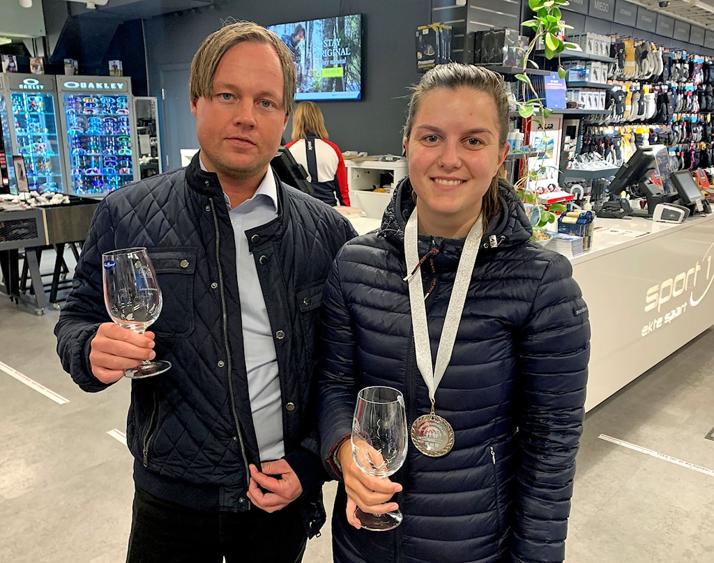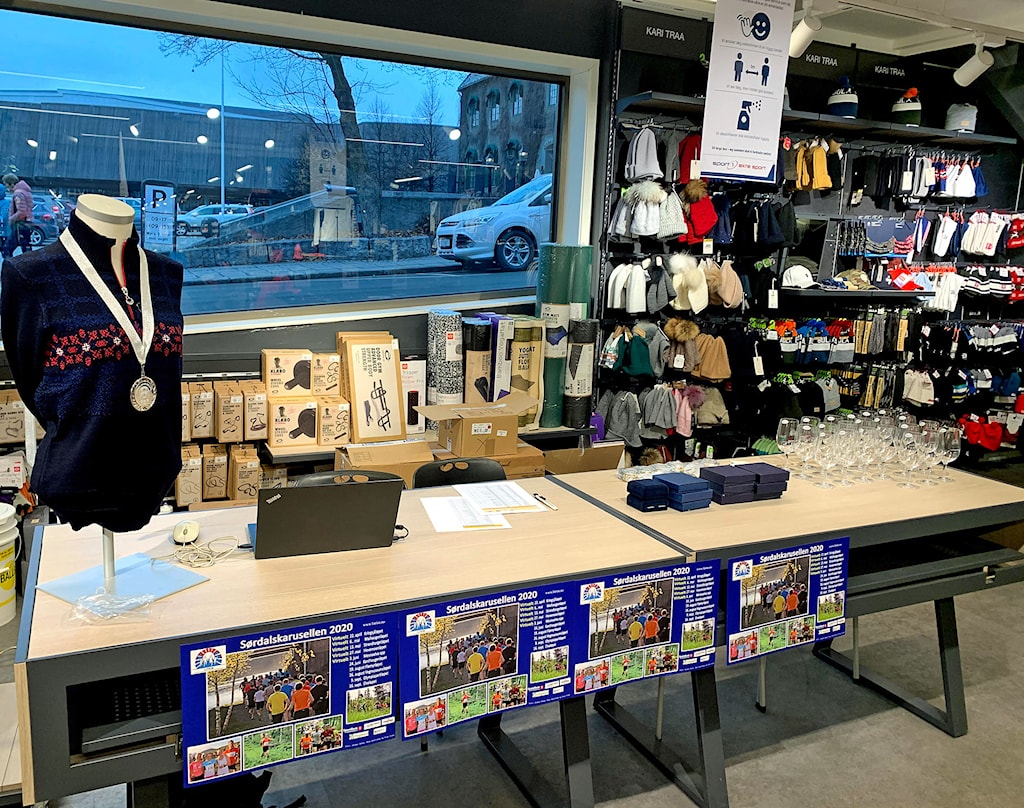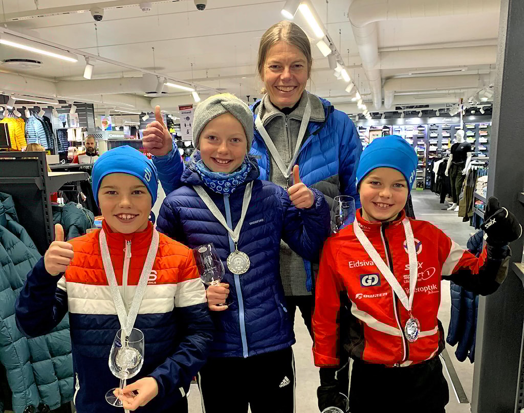 Bjørn Benno, butikksjef Sport1 Lillehammer i Kirkegata tok i mot oss på en fin måte. Han har også sammen med familien sin vært ivrige deltakere i Sørdalskarusellen. Alle fire mor Annica og barna Mathias og Maiken fullførte alle karusellen. Foto: Andris Malasevskis