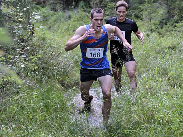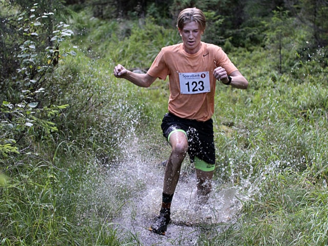 Det ble et vått og ekstra tungt Flømyrløp i kveld. Myrene var våtere og vannputtene hadde ekstra mye vann akkurat som her bare noen hundre meter fra mål. Nattens regnvær hadde tydelig satt sine spor, men heldigvis ble det en fin augustkveld for øvrig. Kjartan Helland, MOI hadde føringen som han beholdt helt inn til mål, tett fulgt av Asbjørn Wold som er fra Vik i Sogn. Wold syntes navnet Flømyrløpet var en riktig betegnelse på løpet Det holdt hva det lovet. (Foto Jørgen Skaug)